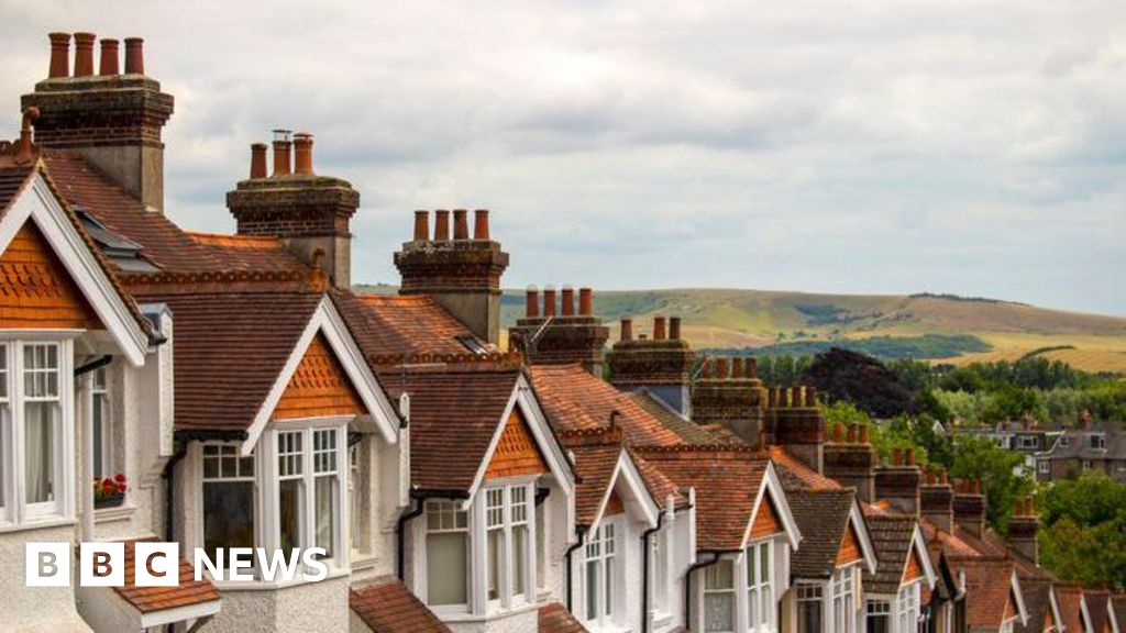 Getty Images A row of rooftops of terraced houses. In the distance there are trees and a hill. The rooftops are red and brown, while the houses are white. The sky is cloudy. Getty Images